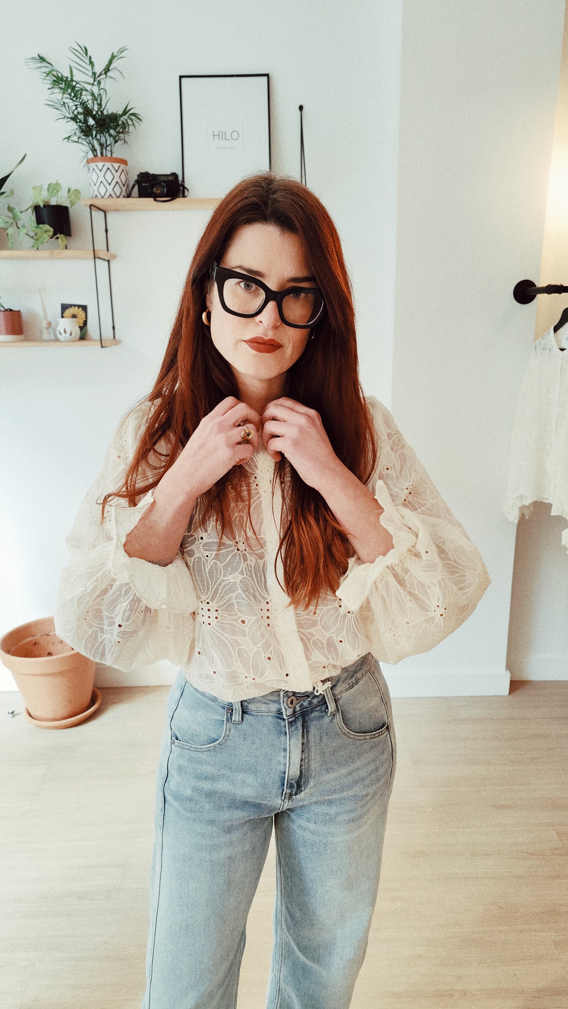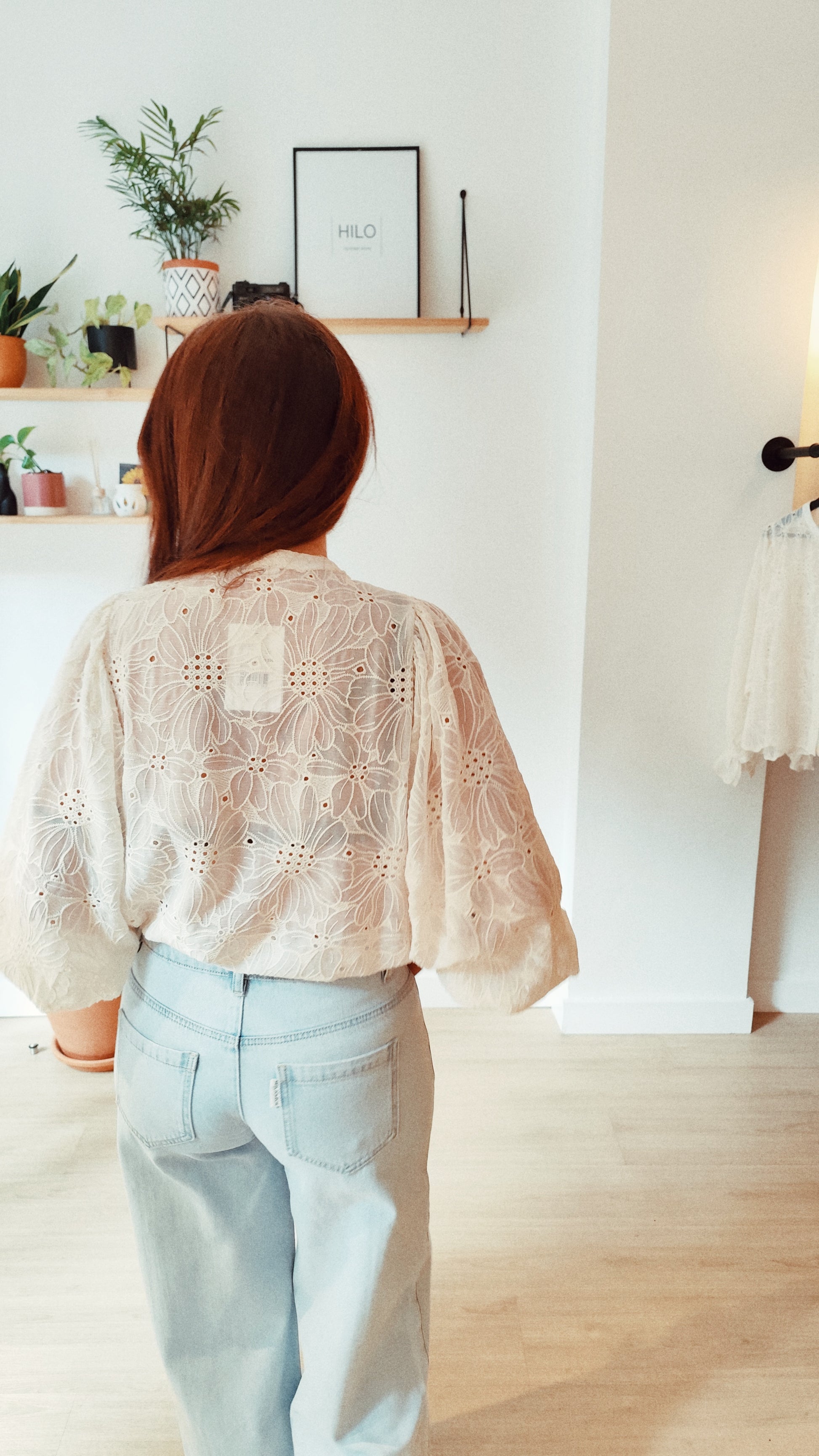 - Material: Confeccionada en un tejido ligero y translúcido, probablemente una mezcla de algodón o lino con bordado perforado.
