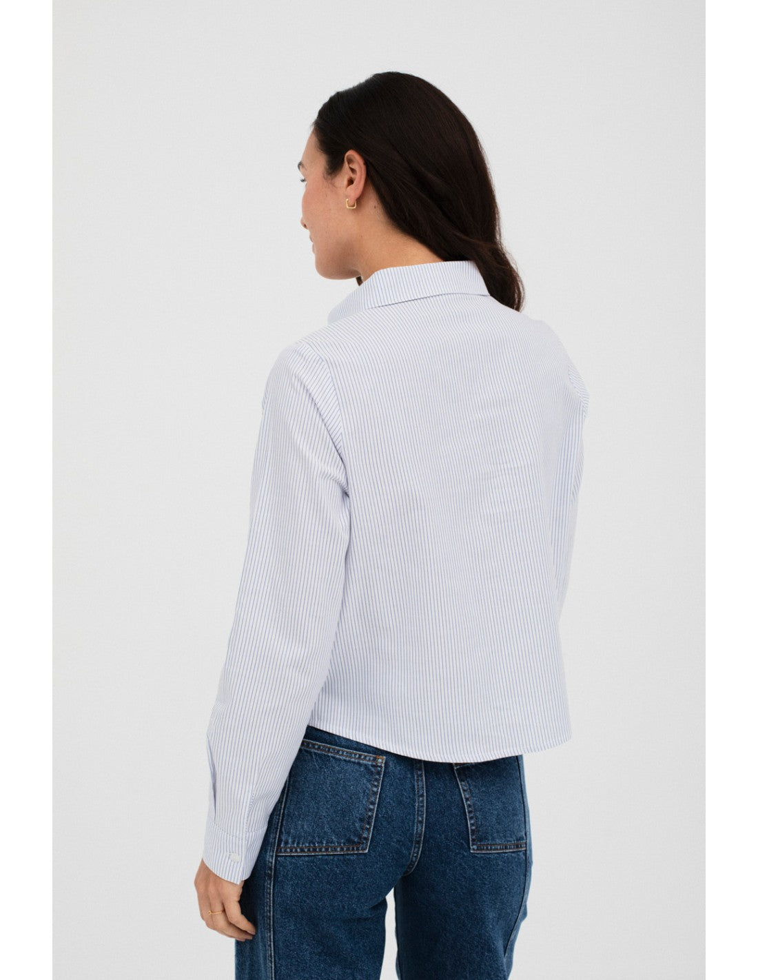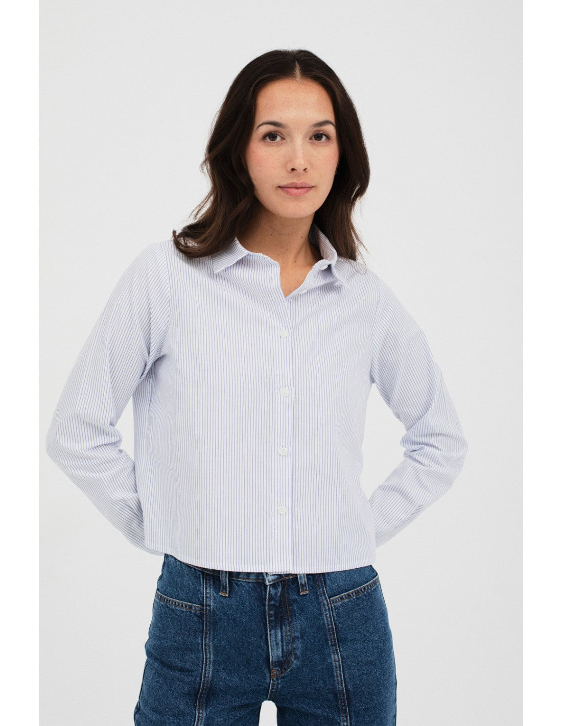 Camisa crop de manga larga, perfecta para darle un toque moderno a tu outfit. Cuenta con un cuello camisero con botonadura frontal y puños con botón. Una pieza de fondo de armario, perfecta para combinar con tus prendas favoritas.