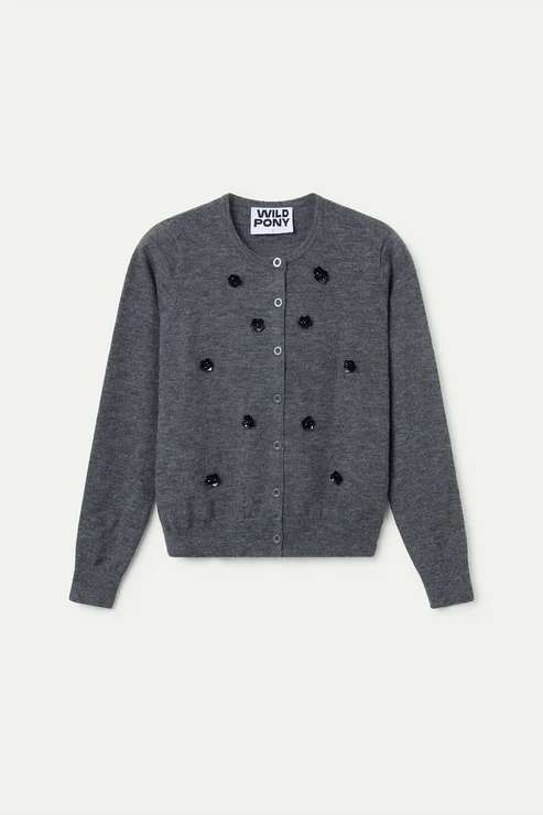 Cárdigan punto de color gris con flores de lentejuelas. Con cuello redondo y manga larga. Cierre con botones.