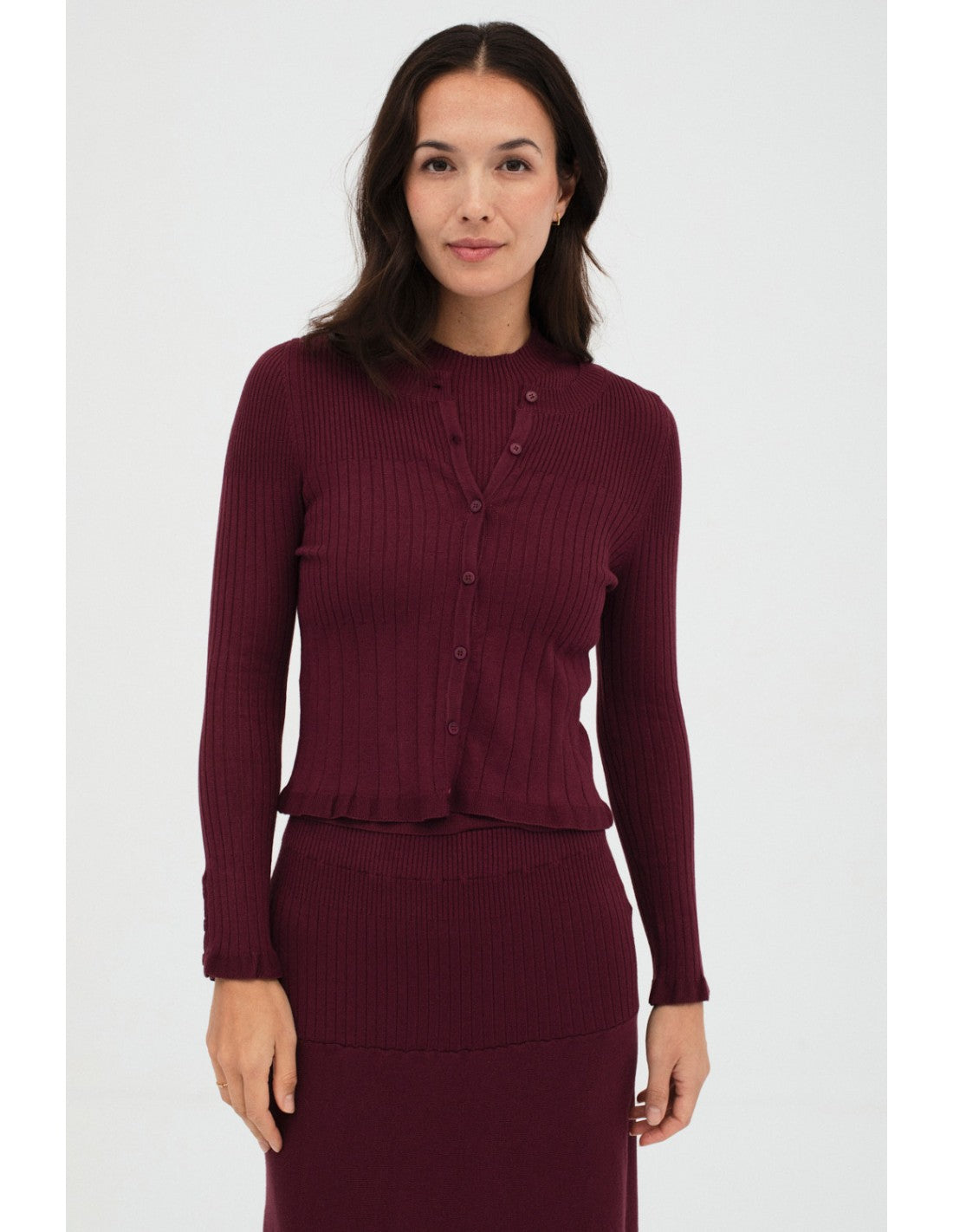 Cárdigan de manga larga y corte recto, con un diseño único que combina tres tipos diferentes de canalé en el cuerpo y dos en las mangas. Tiene un cuello redondo y una abertura con botones en frente. Los puños cuentan con un detalle de tres botones. Combina a la perfección con el top Seef, para un diseño dos piezas.