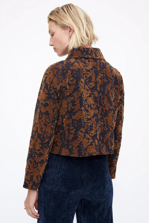 Chaqueta Jacquard color Navy blue y marrón. Con cuello solapa y manga larga. Cierre frontal con botones forrados. Bolsillos laterales.