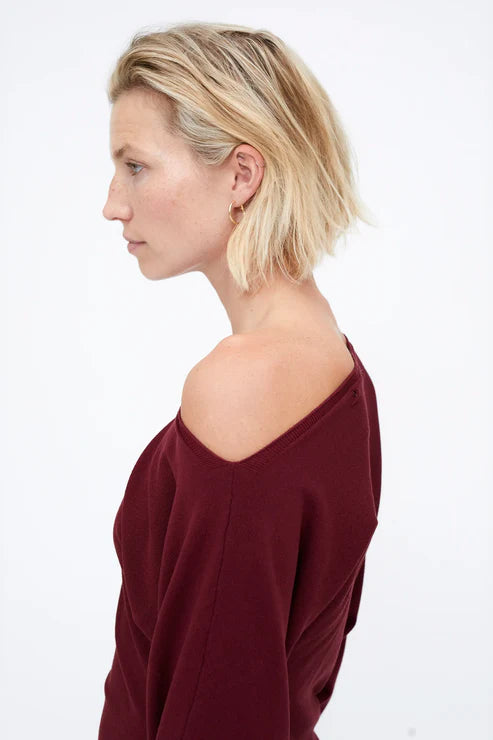 Jersey corte asiméstrico de color Burgundy. Con cuello asimetrico ligeramente caido sobre el hombro y manga larga terminada en rib.