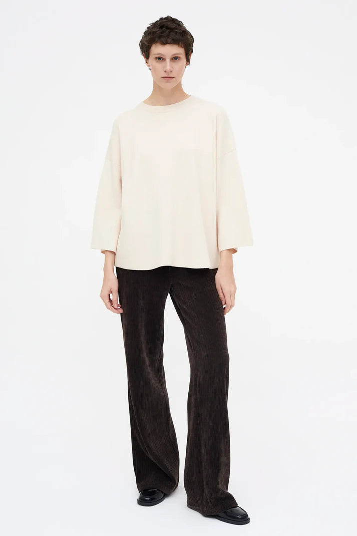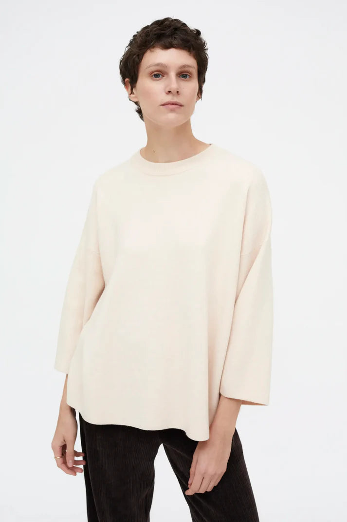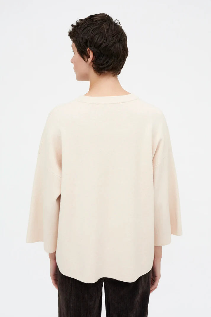 Jersey punto fino manga larga de color blanco. Con cuello redondo y manga amplia francesa con hombro caído.