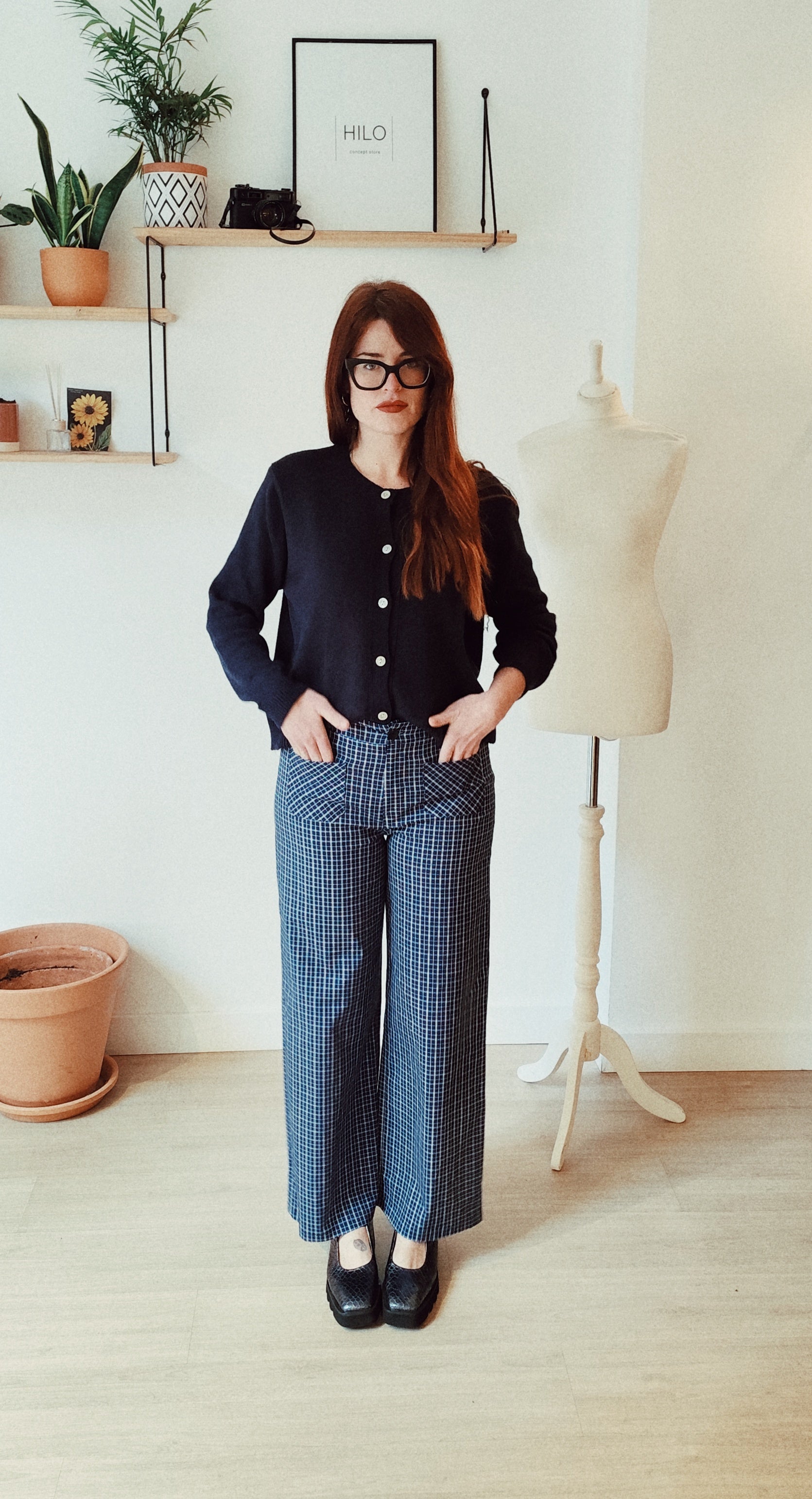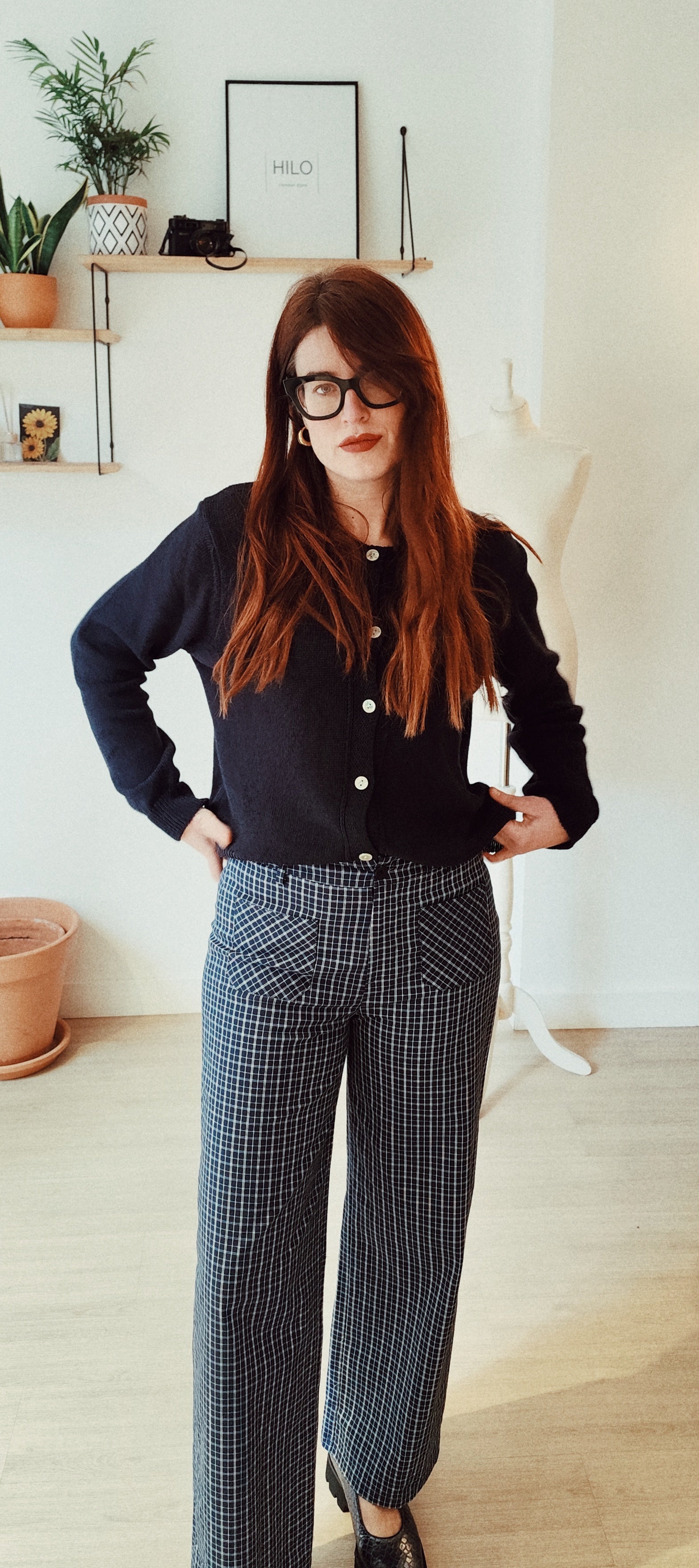 - Descripción corta: Pantalón de tiro alto con un sofisticado patrón de micro-cuadros (ventanilla). Su diseño de pernera ancha aporta movimiento y una estética elegante inspirada en la sastrería clásica.