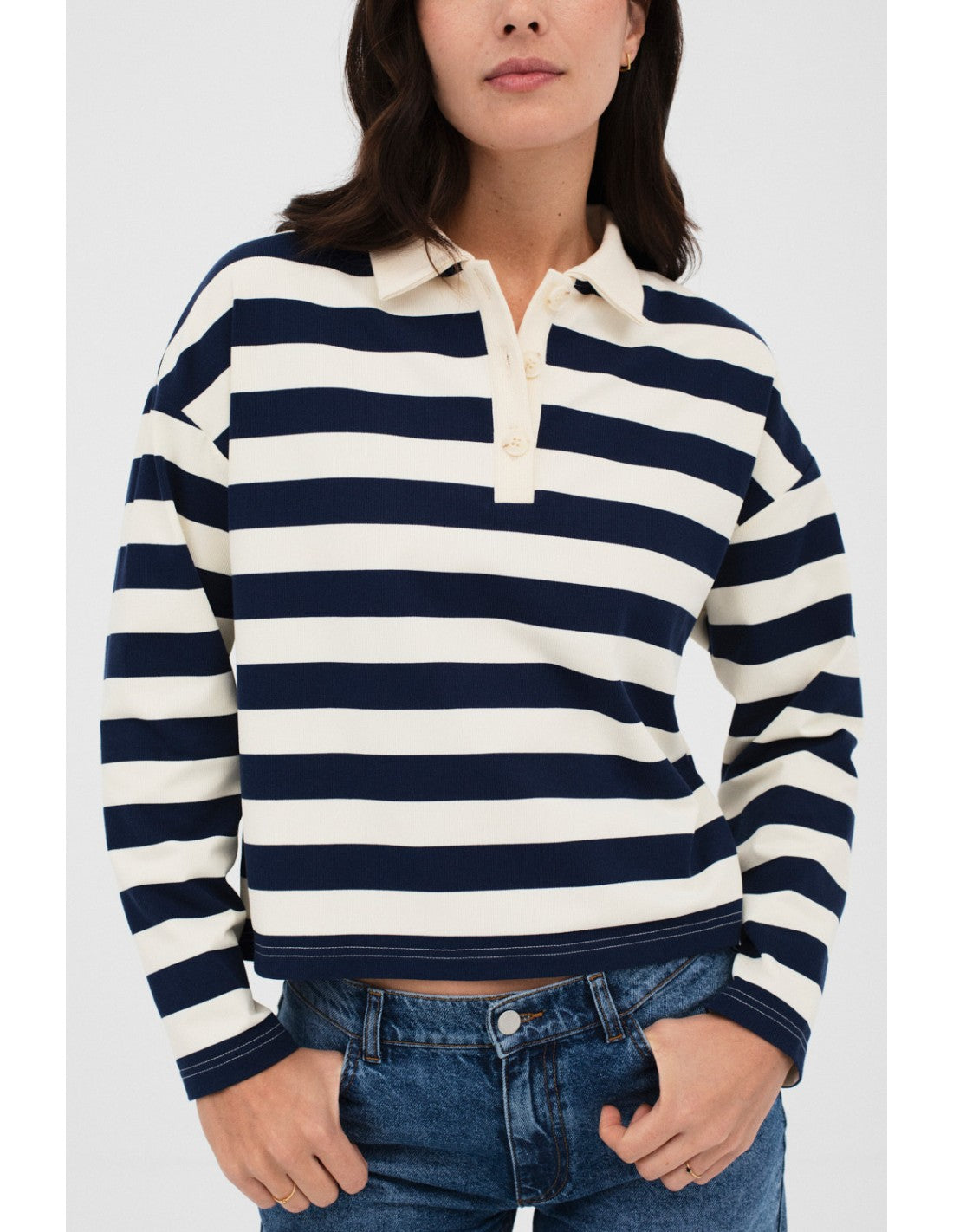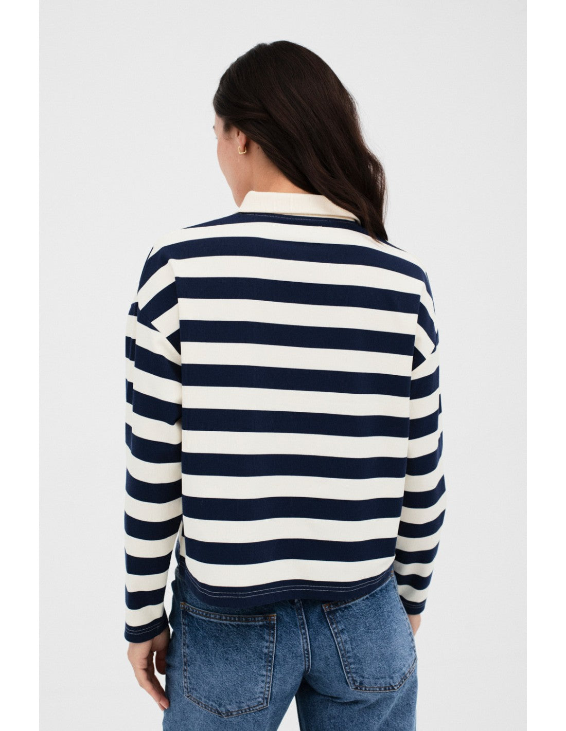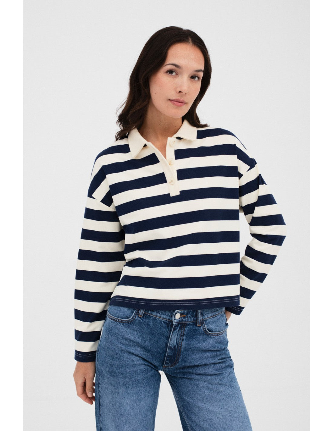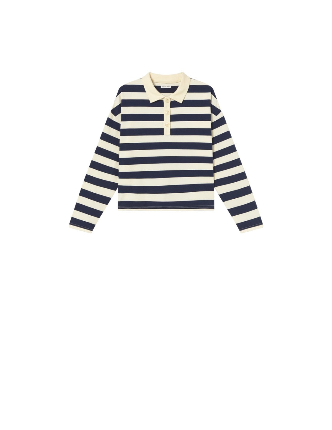 Pedralbes es un polo de rayas anchas y manga larga. Con cuello y tapeta de canalé tipo polo en el mismo tono. Ideal para un look casual.