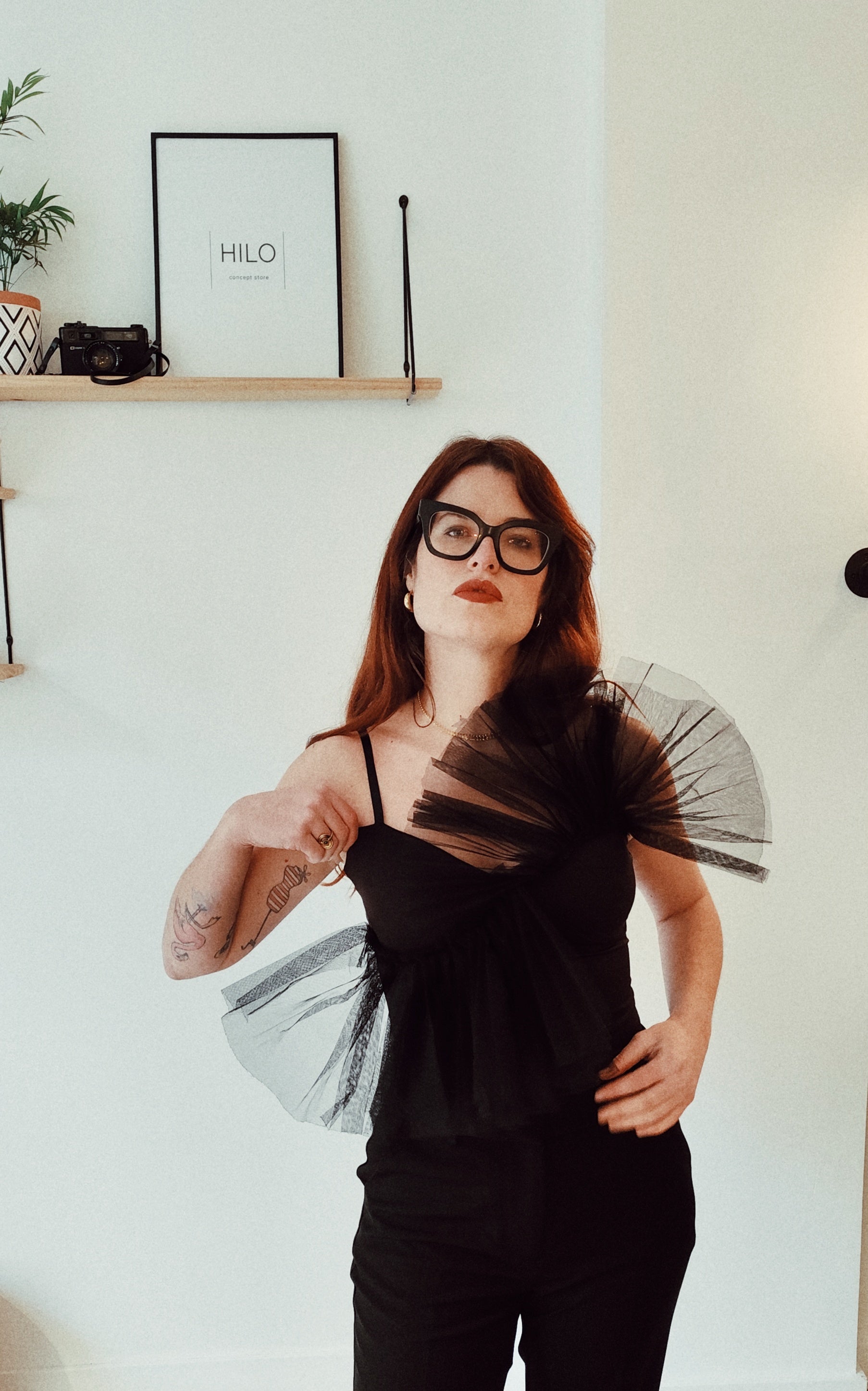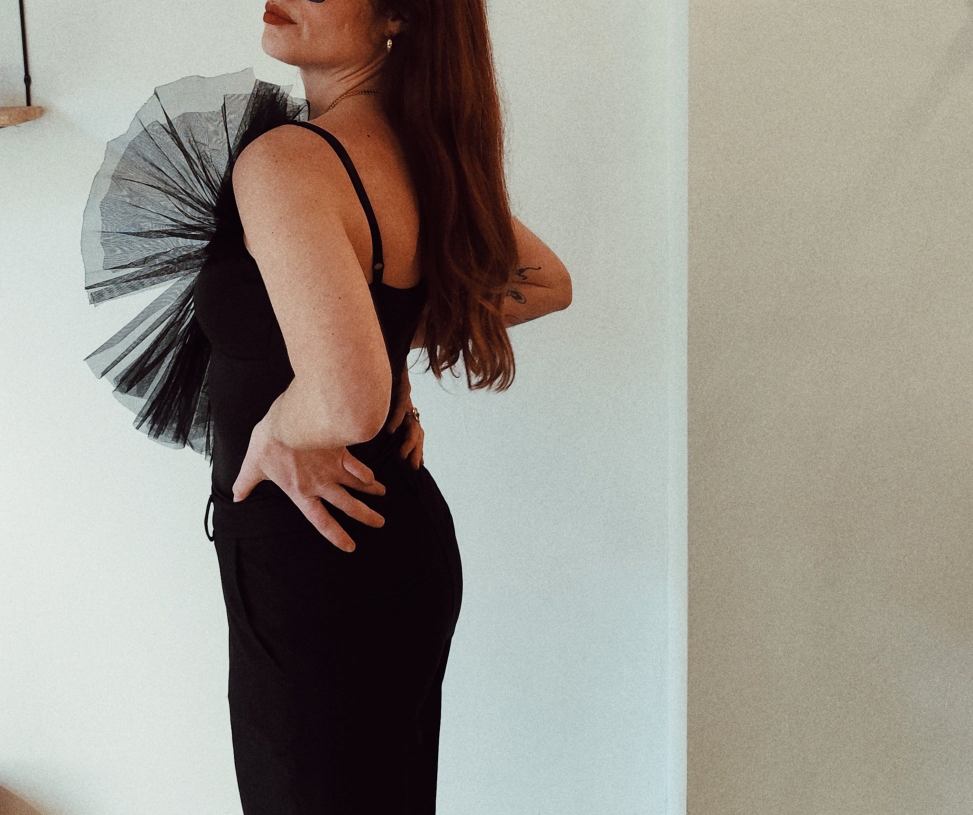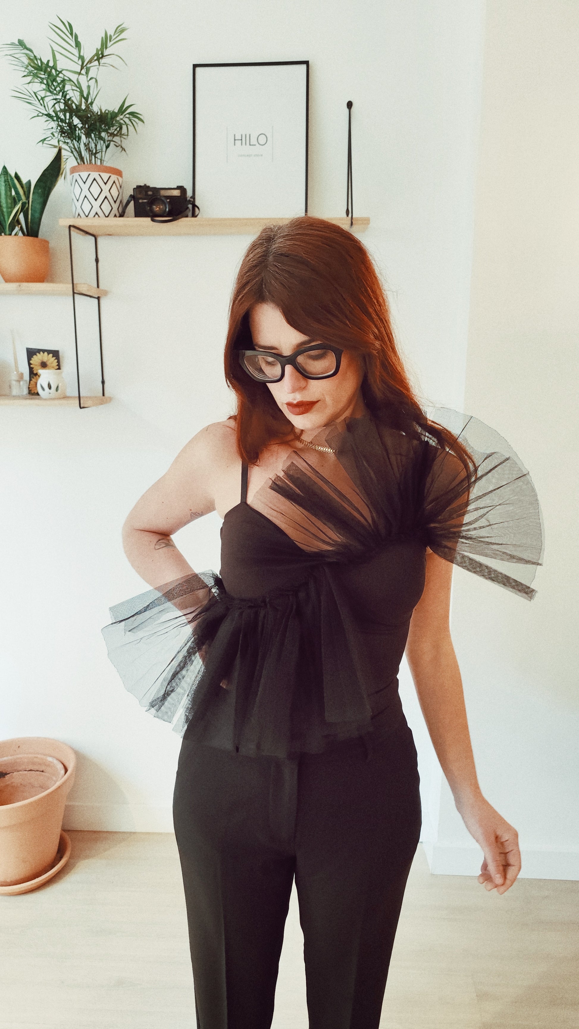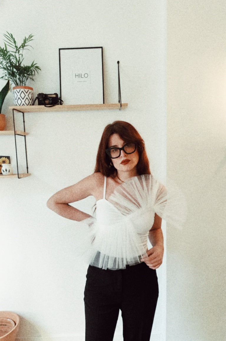 Top negro de tirantes con detalle de tul estructurado en el escote. Una pieza diseñada para quienes buscan diferenciarse, crear su propio estilo y vestir con intención.