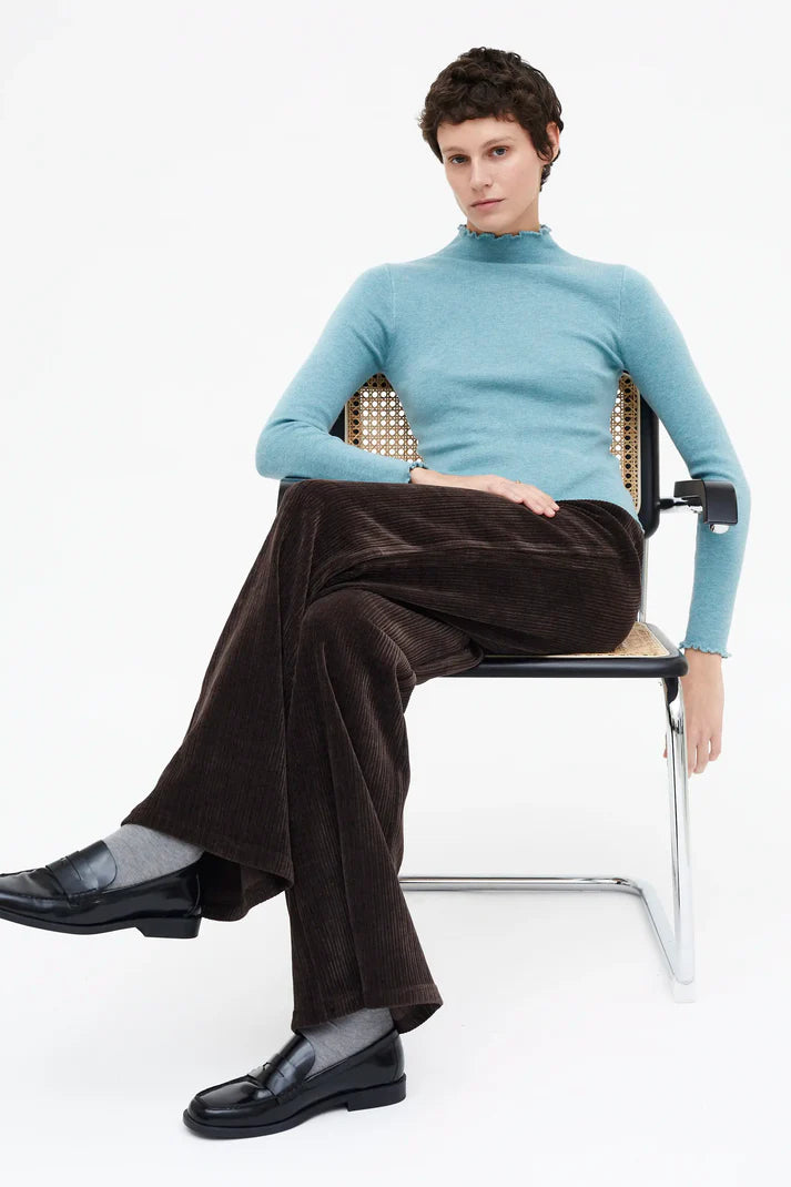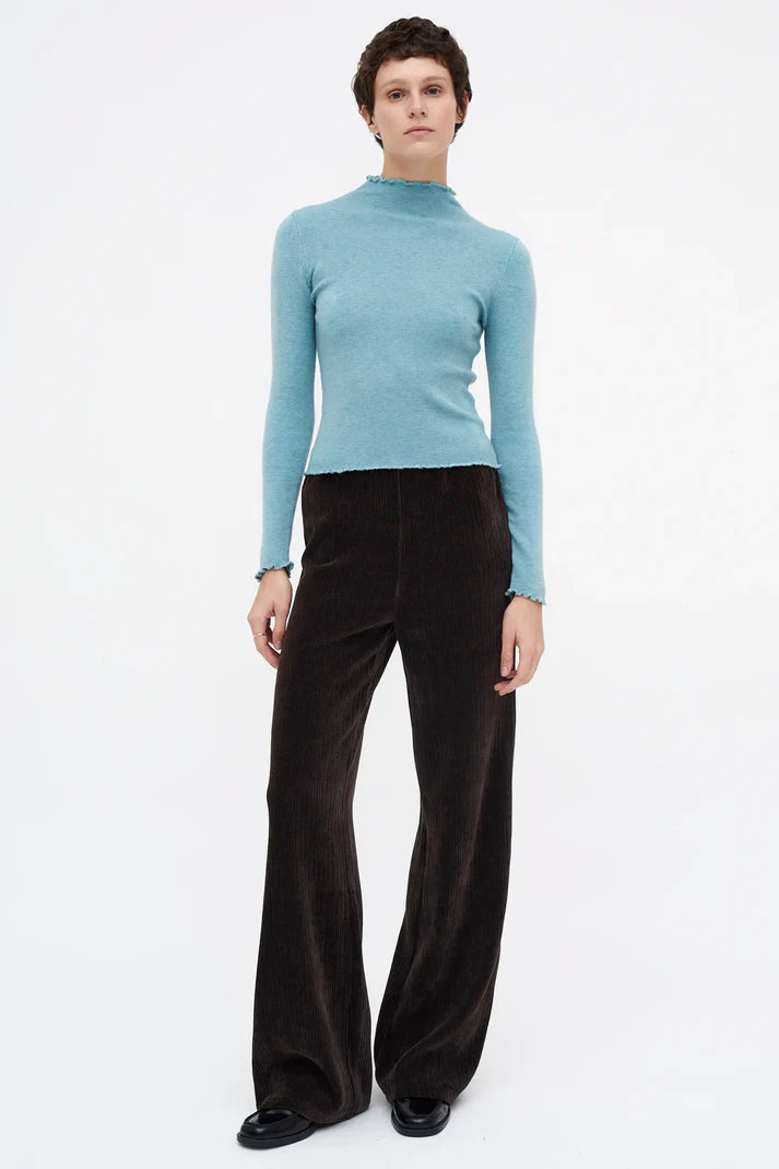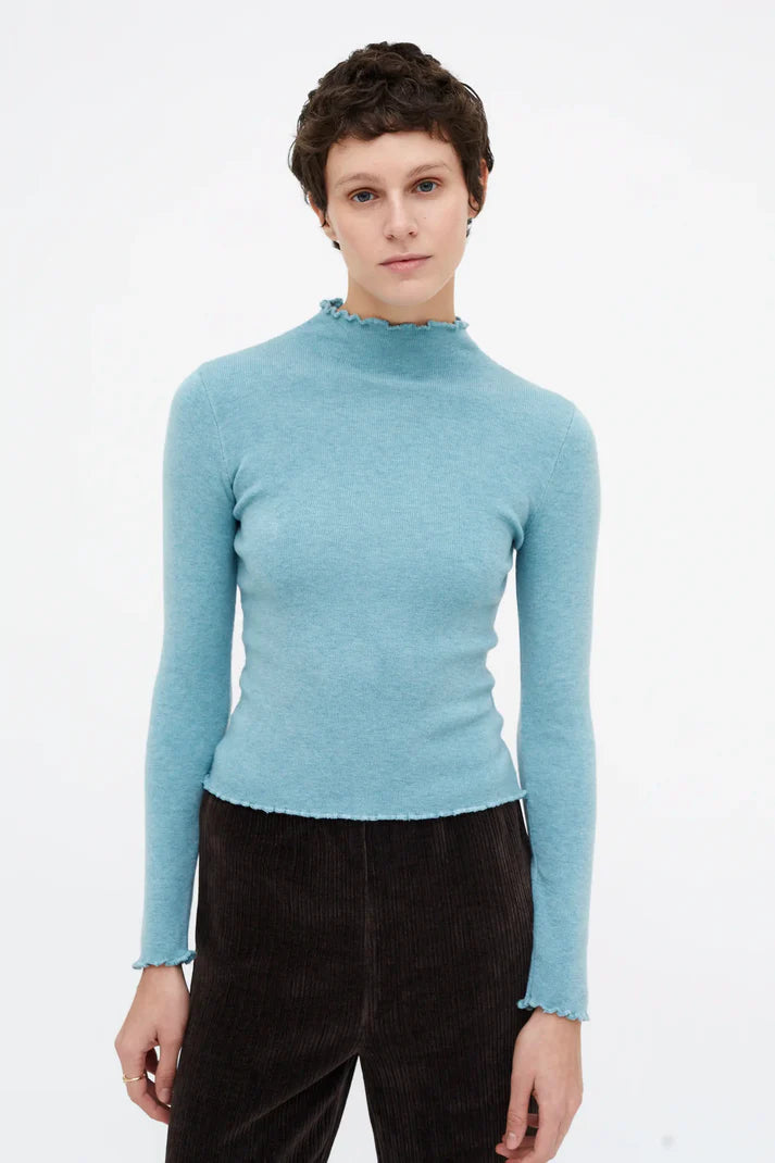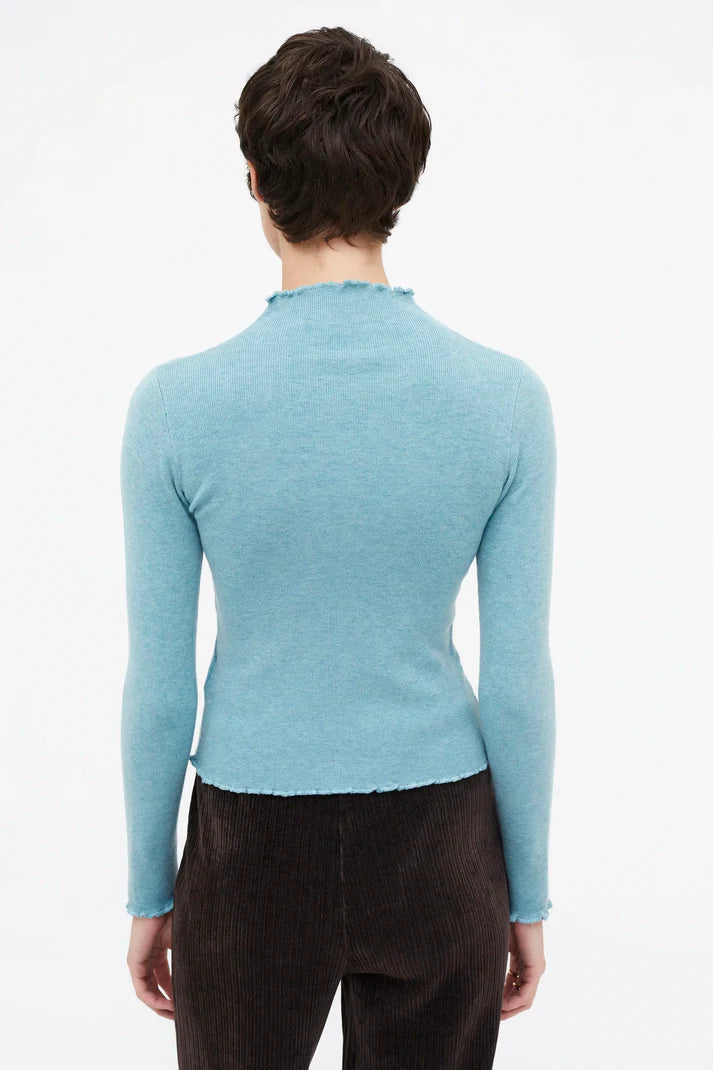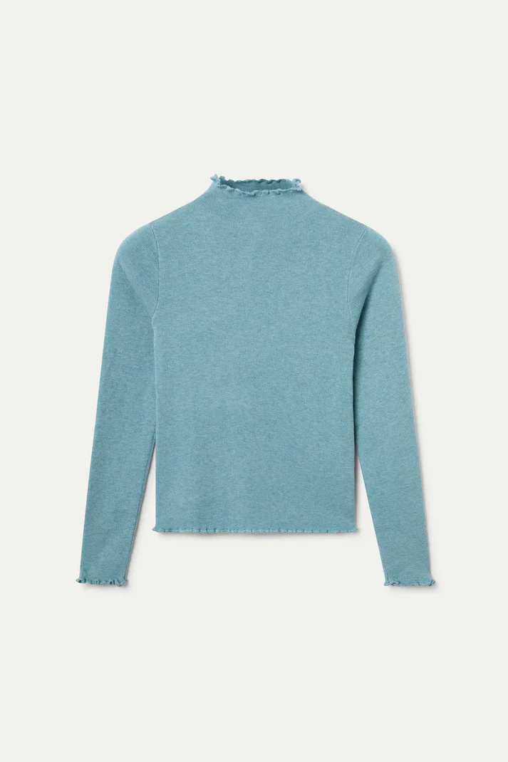 Top punto canalé de color azul. Con cuello perkins y manga larga.
