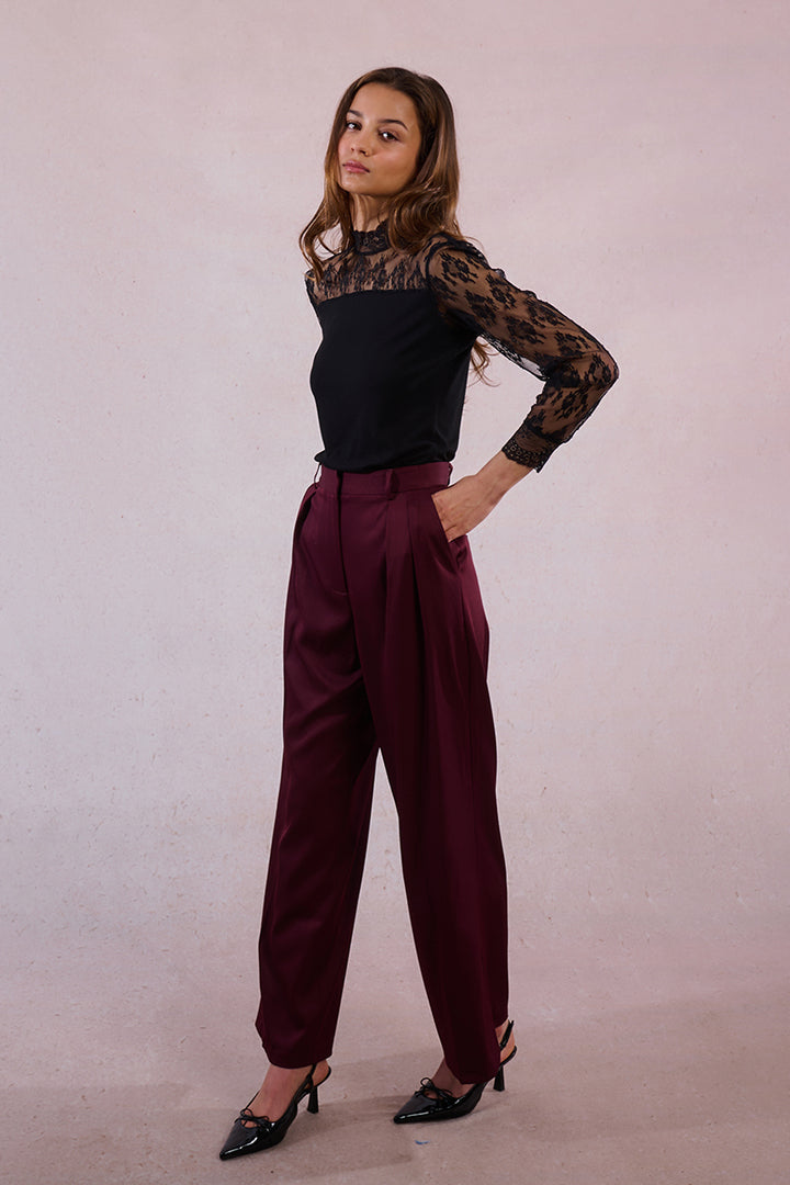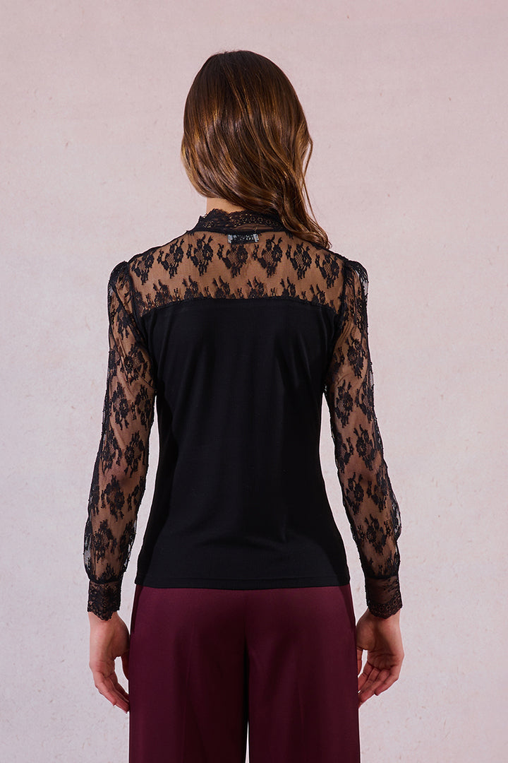 -Suéter ajustado delgado -Bimaterial -Mangas largas de encaje, puños elegantes -Cuello semi-alto -Busto de malla -Longitud desde el hombro 60cm para una talla S"Composición