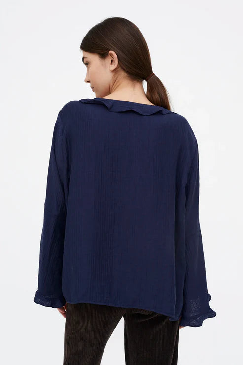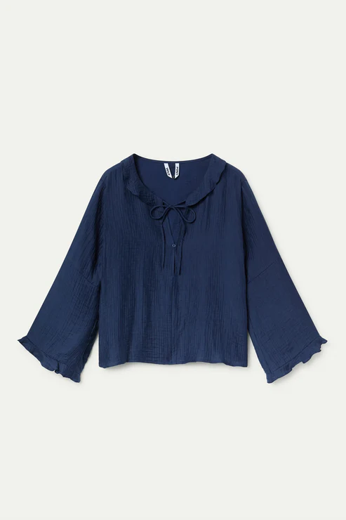 Top fluido color azul. Con cuello redondo nudado, con botón y escote en pico. Manga larga amplia con ligeros volantes.
