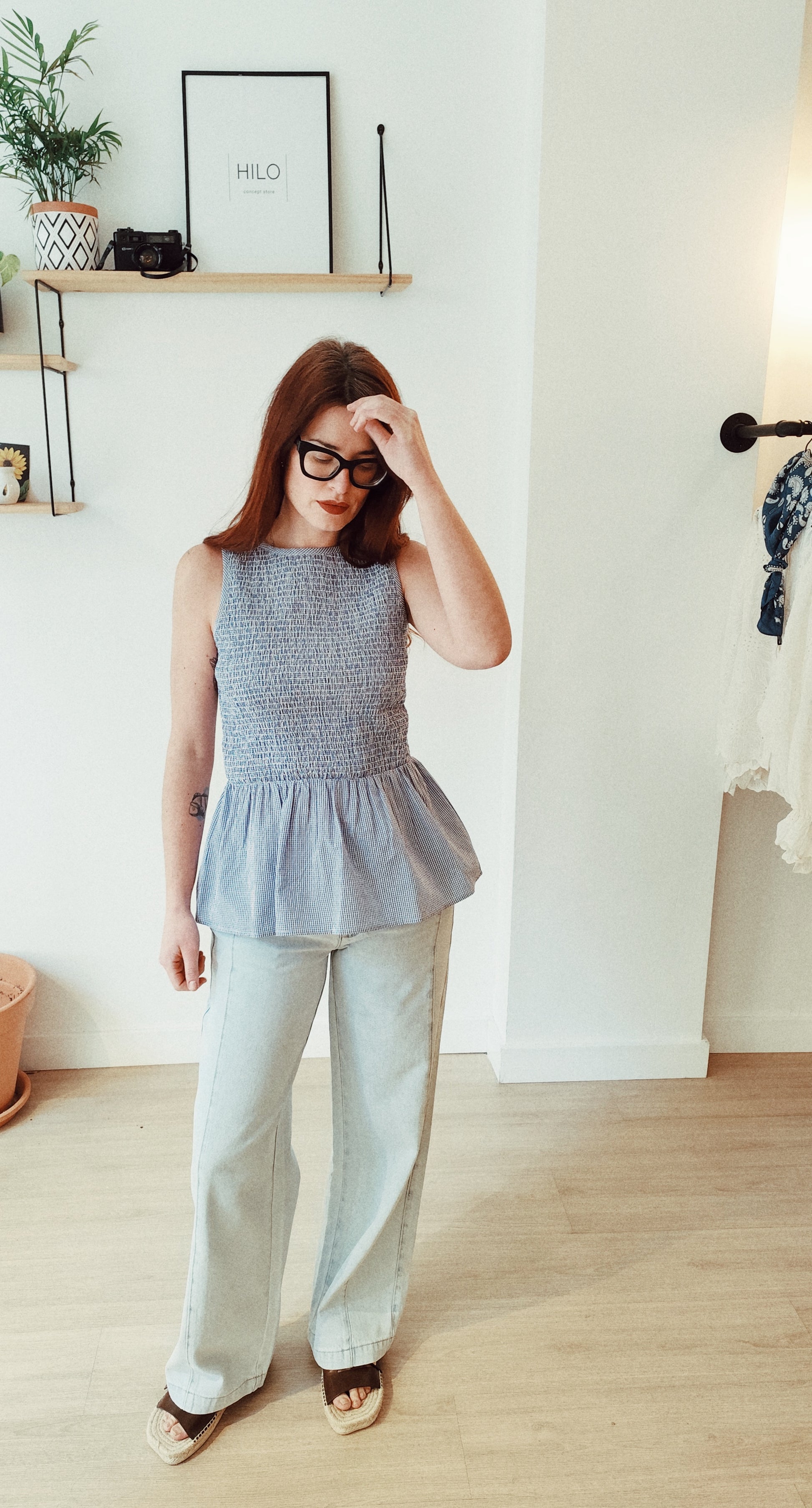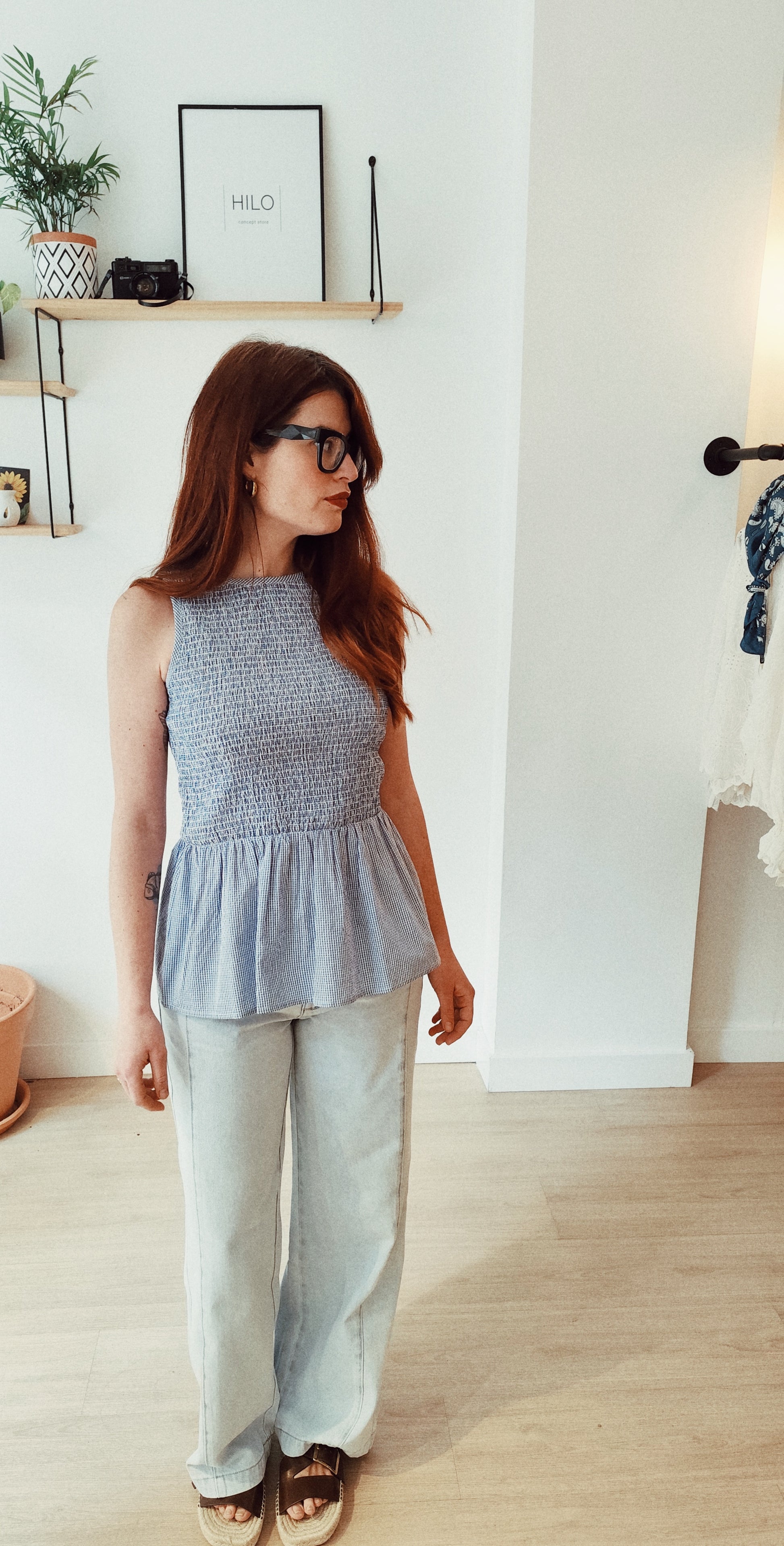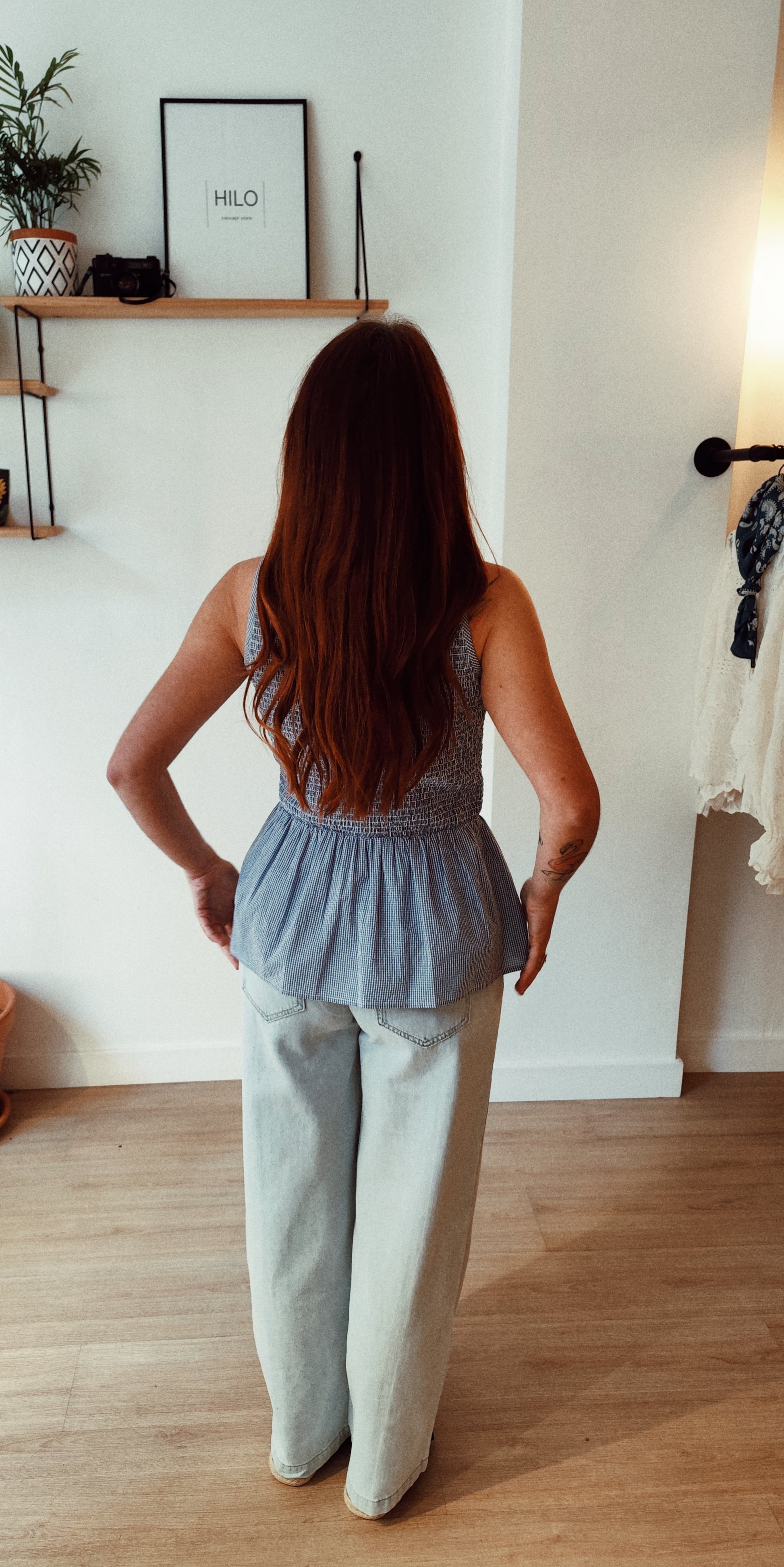 La combinación perfecta de feminidad y comodidad. Este top destaca por su romántico estampado de micro-cuadros vichy en tonos azules y blancos. Presenta un cuerpo elástico íntegramente confeccionado en nido de abeja, que se adapta como una segunda piel realzando el busto y la cintura de forma cómoda. El diseño finaliza con un favorecedor volante tipo peplum que aporta movimiento y un aire chic a cualquier conjunto.