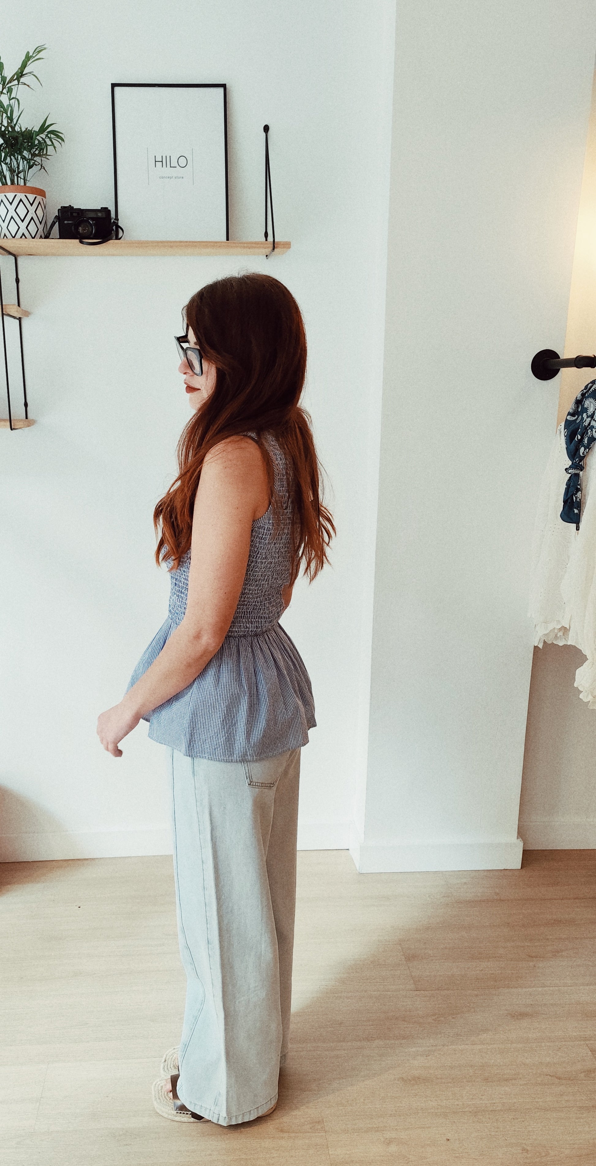 "Este top es el compañero ideal para nuestros Jeans Wide Leg 'Soft Blue'. La mezcla de la textura elástica con el denim fluido crea un look equilibrado y moderno para el día a día."