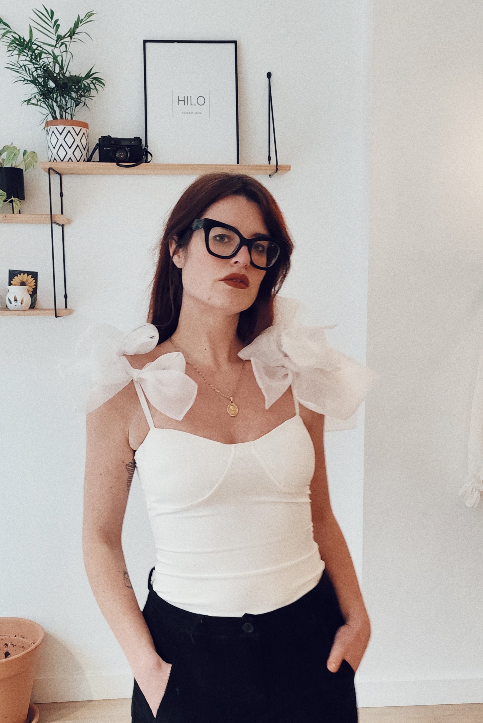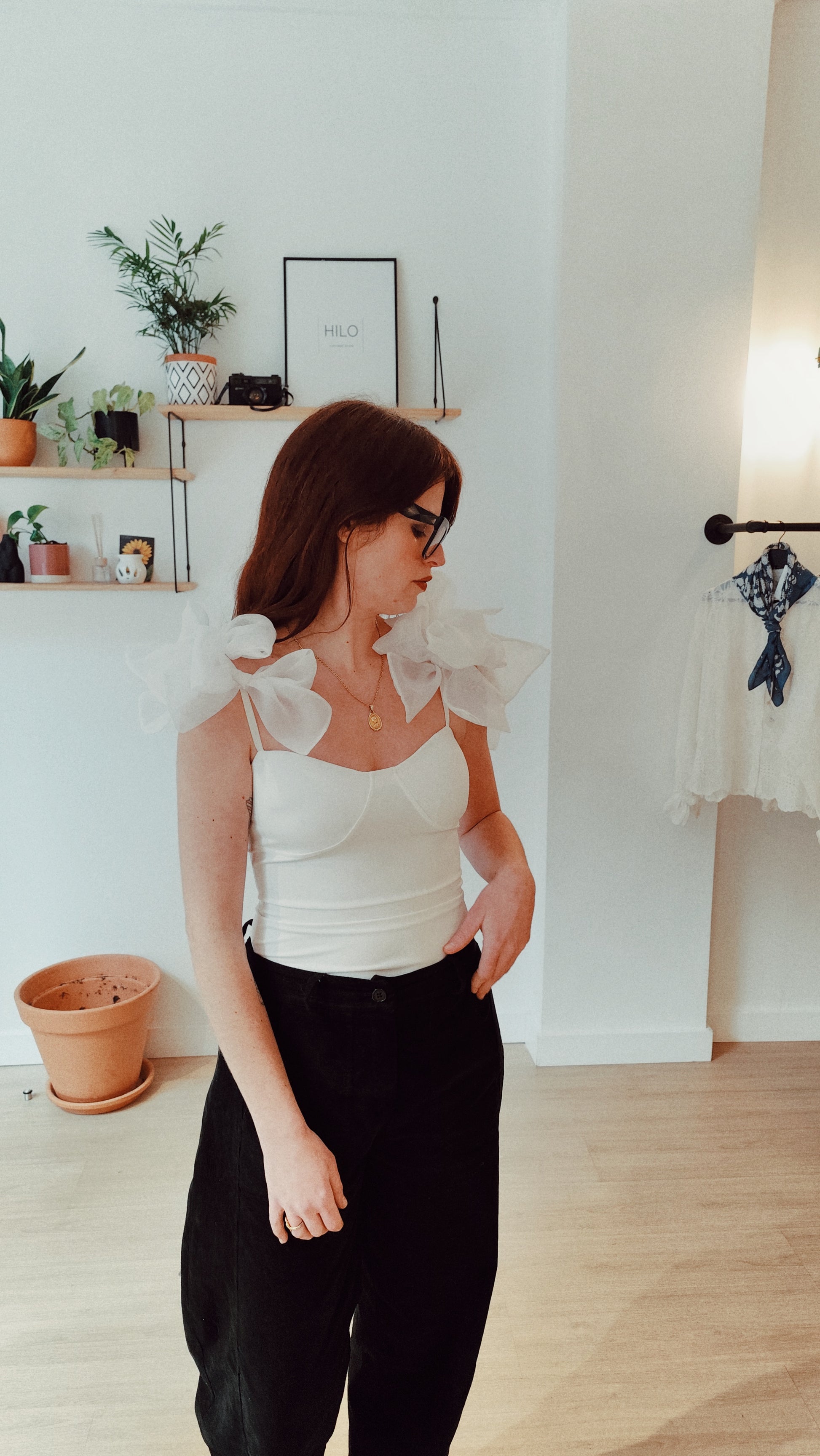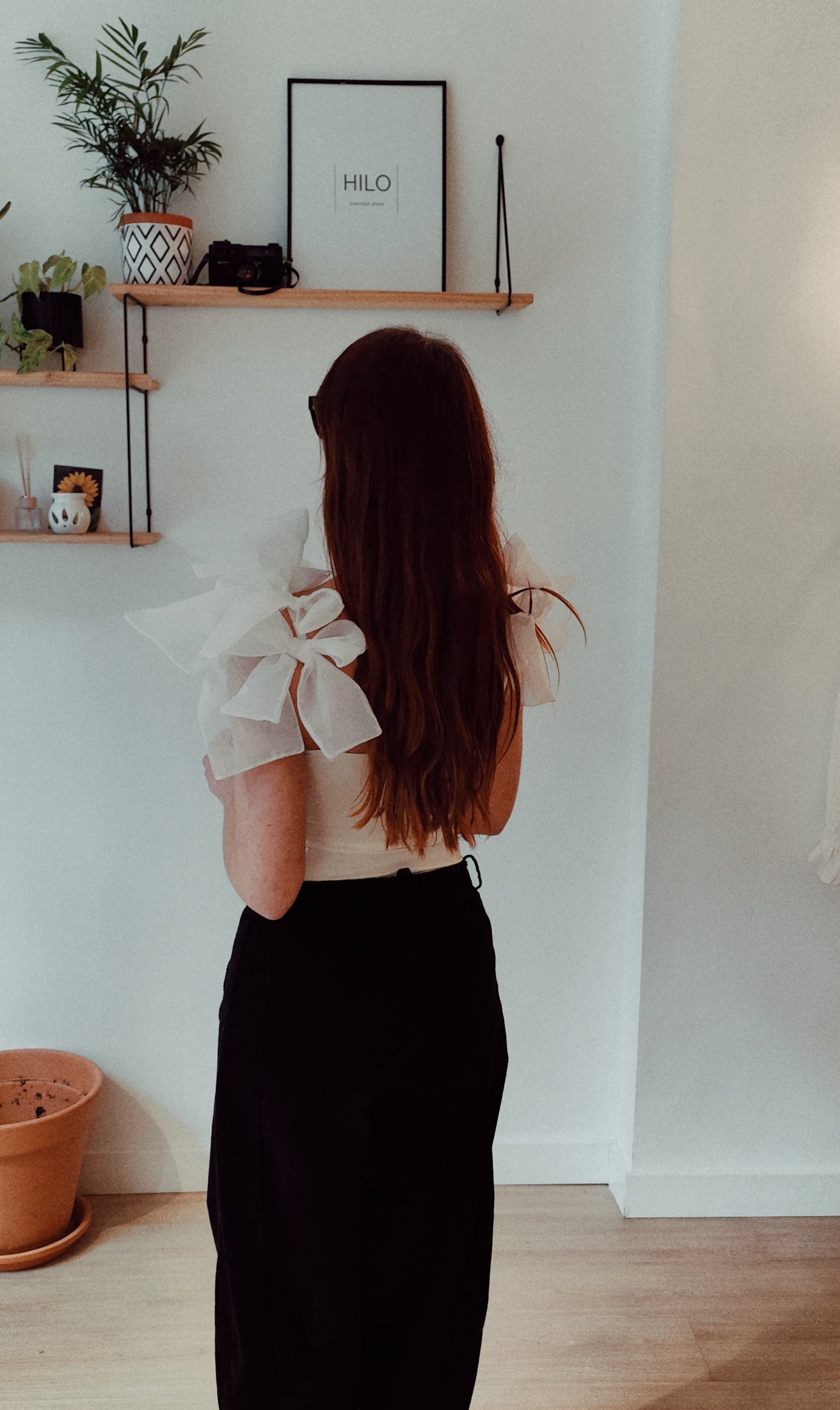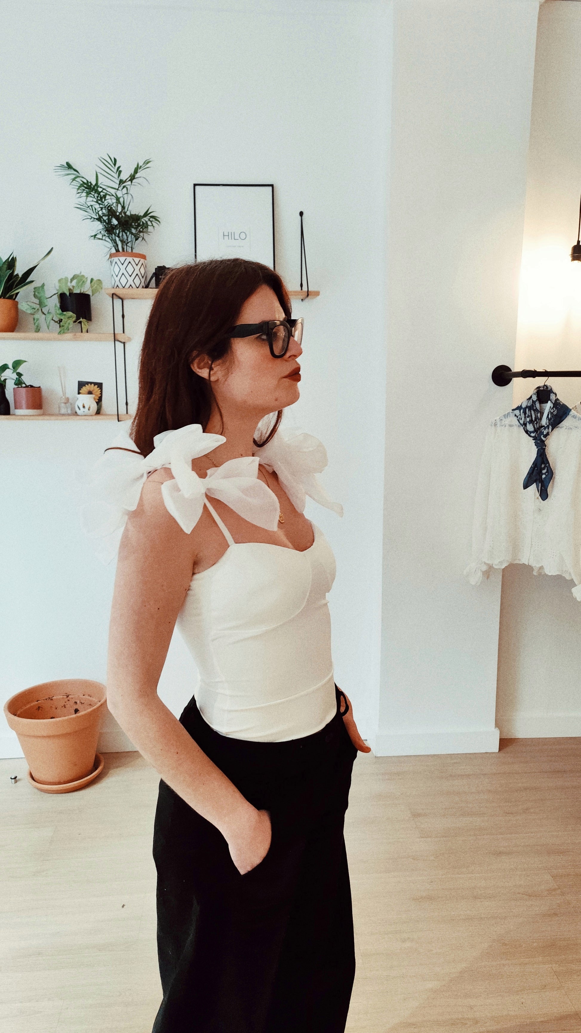 Blanco puro, ligero y delicado, con lazos de organza en los hombros que aportan volumen y movimiento, convirtiendo cada gesto en un pequeño homenaje a la tradición y al estilo propio.