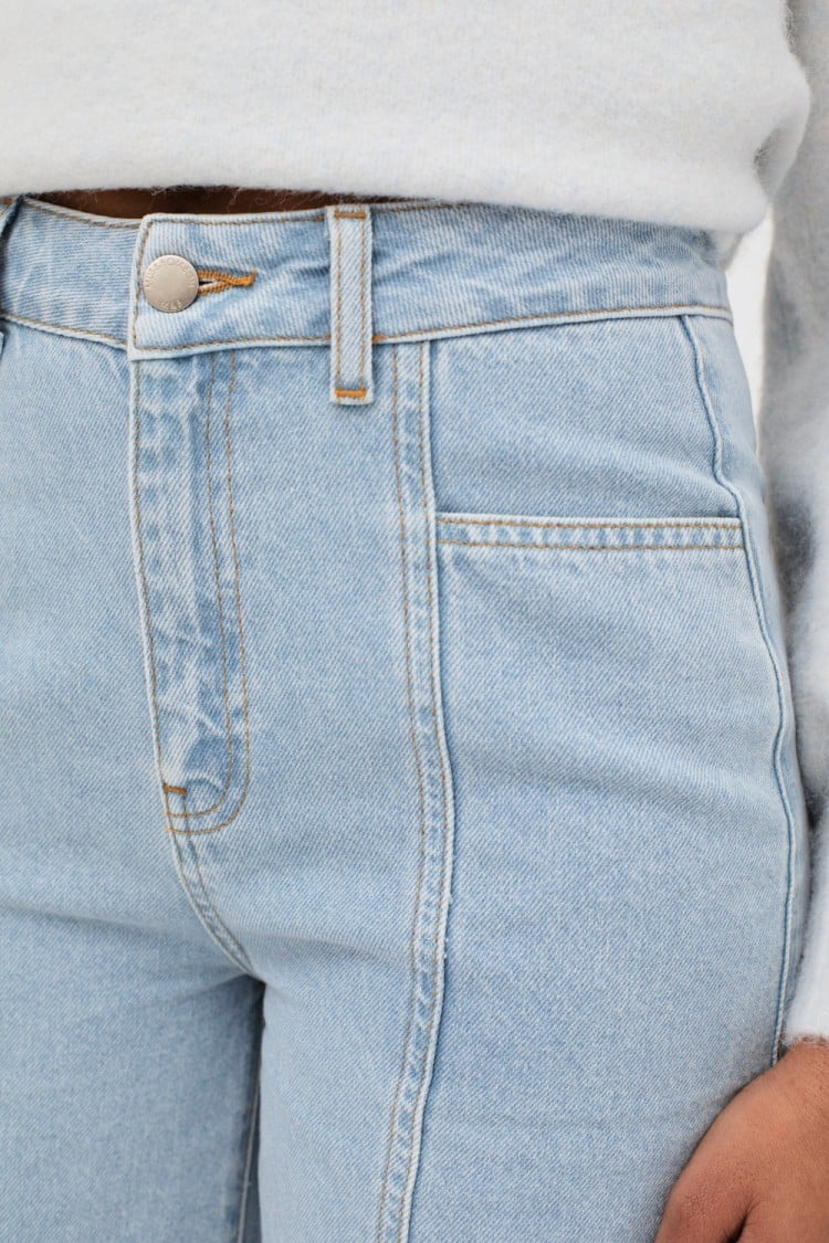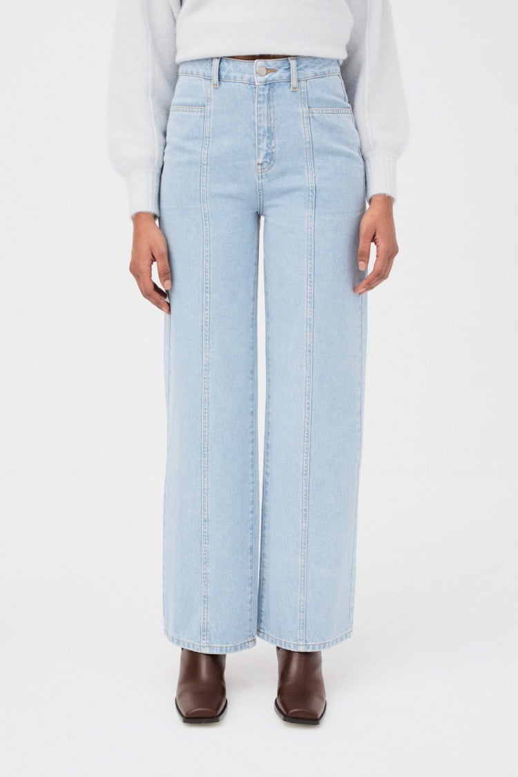 Pantalón tejano de tiro alto y corte ancho, con costuras centrales que aportan un ajuste elegante y moderno.